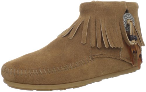 | These Minnetonka Booties have decorative feathers, beading and metal concho detail for style. Product Features: Ultra-comfortable ankle length boots Southwestern styling Decorative feathers, beading and metal concho detail Soft, supple suede Padded cushion insole Santa fe rubber sole ...Read